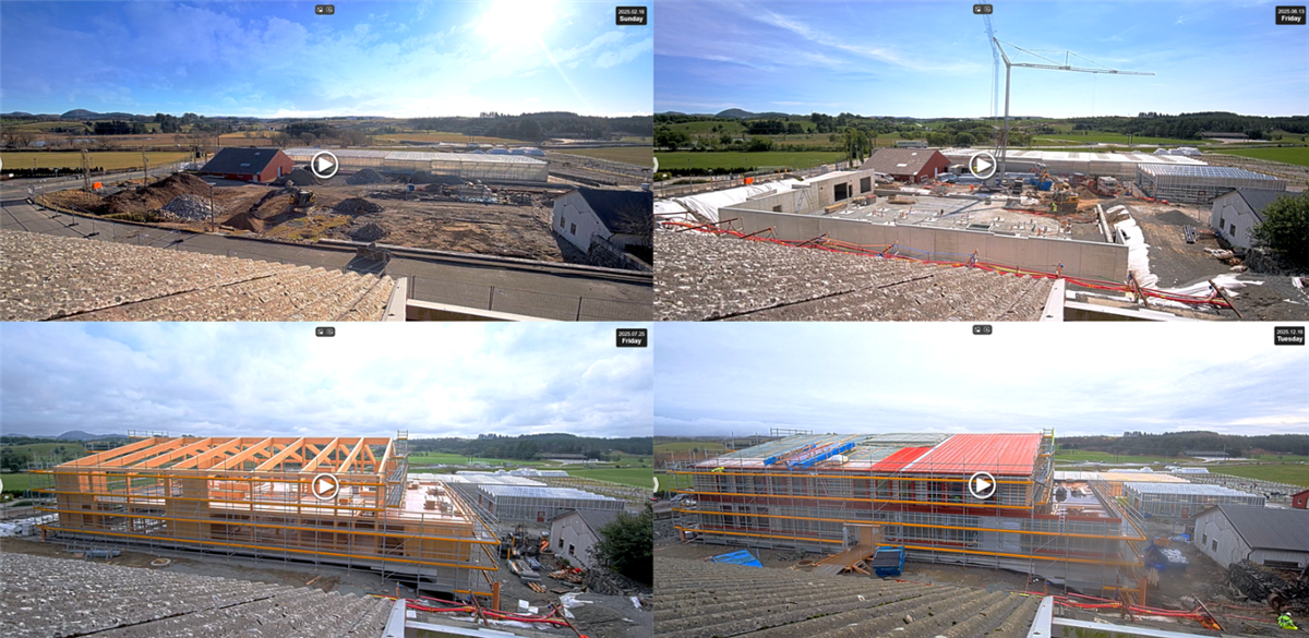 Skjermbildene viser byggeprosjektet på følgende tidspunkter: 16 februar (bilde 1), 13 juni (bilde 2), 25 juli (bilde 3) og 16 desember (bilde 4). Trykk på lenke på slutten av artikkelen for å se timelapse-video.En timelapse-video viser hele prosessen – fra første spadetak til et bygg som nå nærmer seg ferdigstillelse. Skolen overtar bygget i juni 2026, og bygget tas i bruk ved skolestart høsten 2026.